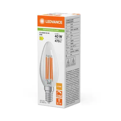 Ledvance Classic LED E14 Bougie Filament Claire 3.4W 470lm - 827 Blanc Très Chaud | Dimmable - Équivalent 40W est le produit de remplacement parfait pour votre ancienne ampoule de 40W avec un culot E14 grâce à sa technologie LED. Passer à la LED vous offrira de nombreux avantages !