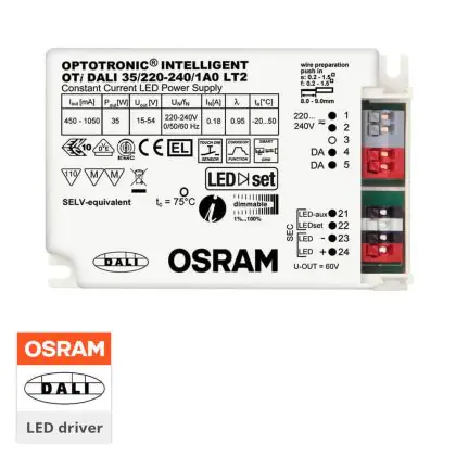 Le protocole DALI (Digital Addressable Lighting Interface) est un système permettant la gestion centralisée d’un groupe de luminaires. Un système DALI permet donc de gérer plusieurs éclairages avec une seule et même commande. Dans le cas de ce panneau, il est possible de le dimmer via ce système. Ainsi, vous pourrez modifier ou ajuster l’intensité lumineuse de ce panneau selon vos envies ou vos besoins. De plus, ce panneau est équipé d’un driver led Osram, ceci renforce la promesse de qualité proposée par Noxion en s’appuyant sur des composants des plus grands noms de l’éclairage.