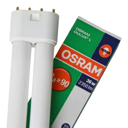 Les Osram Dulux L DE LUXE sont des lampes fluocompactes très économes en énergie. Comparé aux ampoules Dulux L classiques, leur indice de rendu des couleurs est bien meilleur. Ces lampes s'utilisent uniquement sur ballast électronique. D'une longueur de 411 mm elles disposent d'un culot 2G11, composé de 4 broches.